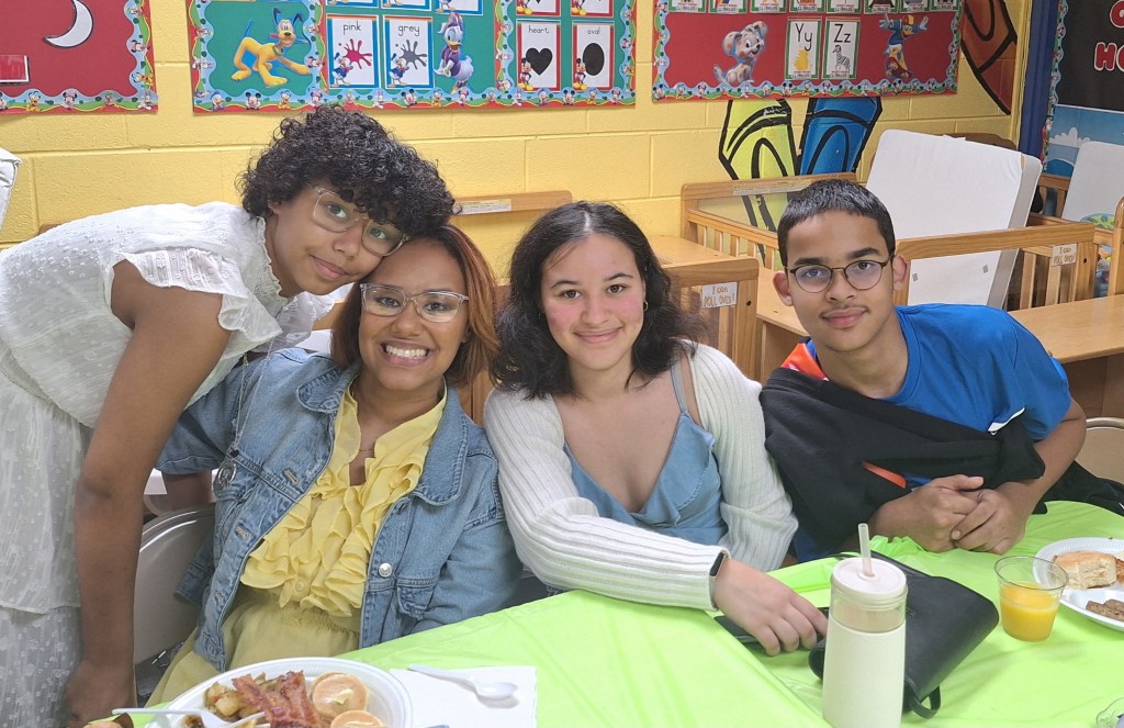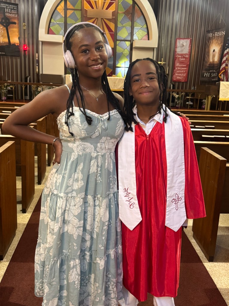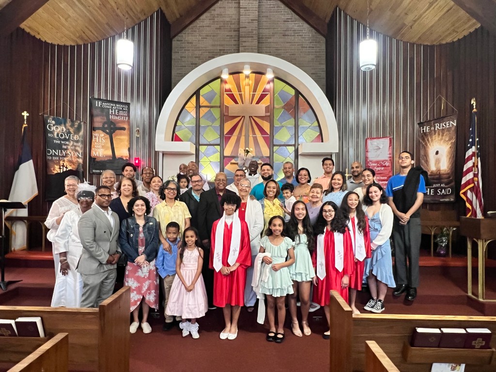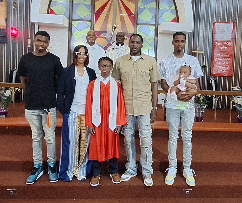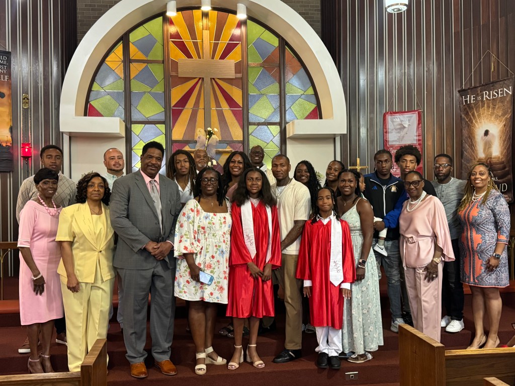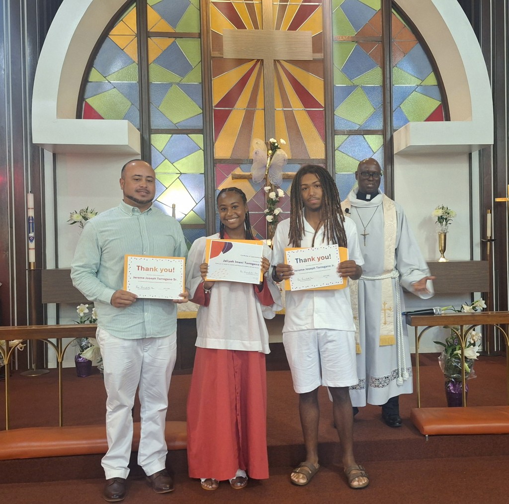 Below is a picture of Pastor’s helpers throughout Confirmation Class. They helped with setting the tables, chairs and also took them down when class was over. From L-R; Jerome Torregano Sr., Jaliyah Torregano and Jay Torregano Jr.